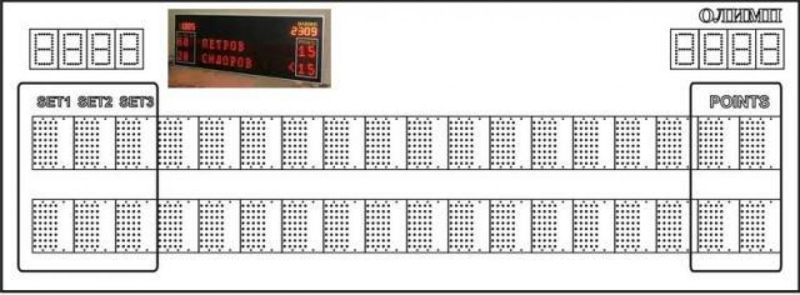 Табло для большого тенниса электронное, яркость - 500 мКд; дальность просмотра - 50м; габаритные размеры: 2500мм х 900мм х 90мм.