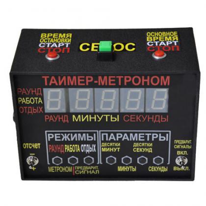 Возможности:Задание любых интервалов времени от 2 сек. до 99 мин. 59 сек. возможно с шагом 1 сек. Число раундов от 1 до 99.Индикация прошедшего или оставшегося времени. Отсчет "чистого времени".При остановке отсчета времени работы, возможен отсчет время остановки.Количество циклов (работа-отдых) может быть "без ограничений".Звуковые сигналы разного назначения выдаются с различной частотой звука.Предусмотрен режим специальных предупредительных сигналов в конце перерывов и возможность отключения всех звуковых сигналов.Спортивный таймер имеет разъем для подключения внешнего усилителя.Может быть дополнен демонстрационным табло для зрителей и судей.В спортивном таймере с демонстрационным табло предусмотрена регулировка громкости сигналов и выдача произвольного сигнала.Выполняется с механическим программатором или с клавишным управлением.