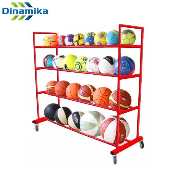 Мобильная тележка для мячей предназначена для использования в спортивном зале. Служит одновременно стеллажом и тележкой для хранения мячей, при необходимости позволяет подвозить их до нужной точки зала.