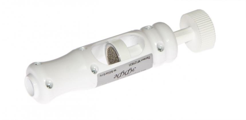 3. Вращательными движениями поршня точилки с легким нажимом обрабатывайте наклейку кия до состояния, которое Вам необходимо. За пару минут можно достичь небольшого косметического эффекта – подправить сферу наклейки, убрать микро-вмятины и взрыхлить на ней ворс. Обрабатывая наклейку более длительное время, Вы можете придать ей идеальную сферическую форму, в каком бы первоначальном состоянии она ни была.