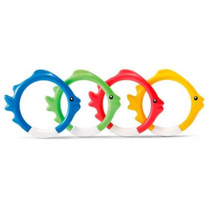 В набор входит 4 ярких кольца в виде рыбок. Мягкий и гибкий материал изготовлен для безопасных игр.
