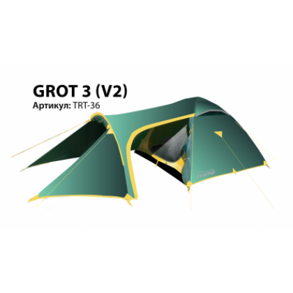 Палатка TRAMP GROT 3 (V2) - туристическая походная модель для установки лагеря: весной, летом, осенью. Дана продукция пользуется большим спросом и популярностью среди поклонников пеших походов и велосипедных путешествий. Также очень известна среди мотоциклистов и охотников. Штатно рассчитана на три человека, хотя могут быть размещены и 4 туриста. Палатка имеет внешний тент, два отдельных входа, оборудован съемным полом. В наличии имеются стальные колышки, с расчетом на всю палатку и на штормовые растяжки. Конструкция - обтекаемая "полусфера" с отдельной дугой для тамбура.