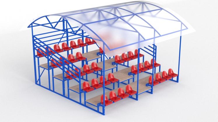 Трибуна с навесом 5-ти рядная с ограждением. Разборная трибуна на 42 места, собирается с помощью болтовых соединений. Не требует специального оборудования.