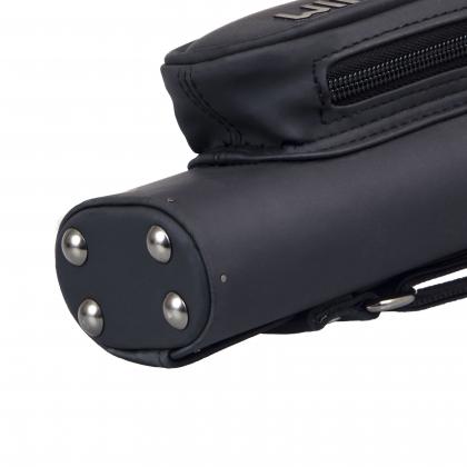 Есть ручка сбоку и наплечный ремень с регулировкой длины. На ремне есть специальная вставка для комфортной носки на плече. Каждая часть кия хранится в отдельном отсеке. С внешней стороны имеются карманы для аксессуаров и удлинителя. Большой карман внутри снабжен дополнительной молнией для надежной фиксации.