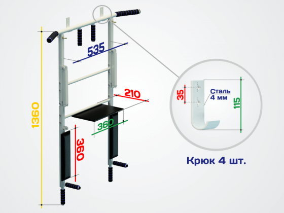 Вынос: по брусьям: 81см; по турнику: 55см; в сложенном виде: 16см