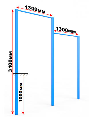 Характеристики:Стойки из трубы Ø=76 мм;Перекладины из трубы Ø=32 мм;Общая ширина турника 2600 мм;Высота турника (с бетонируемой частью) 3100 и 2100 мм;Высота турника над уровнем грунта 2100 и 1600 мм.