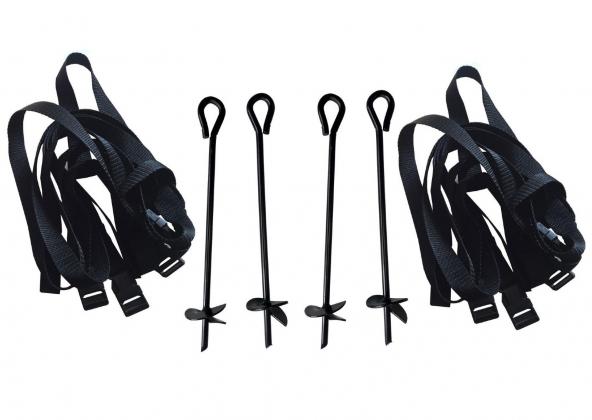 Универсальный крепёж батута к грунту. Набор состоит из 2-х анкеров и ремней помогает закрепить батут к грунту и предотвращает его движение во время прыжков и сильного ветра.