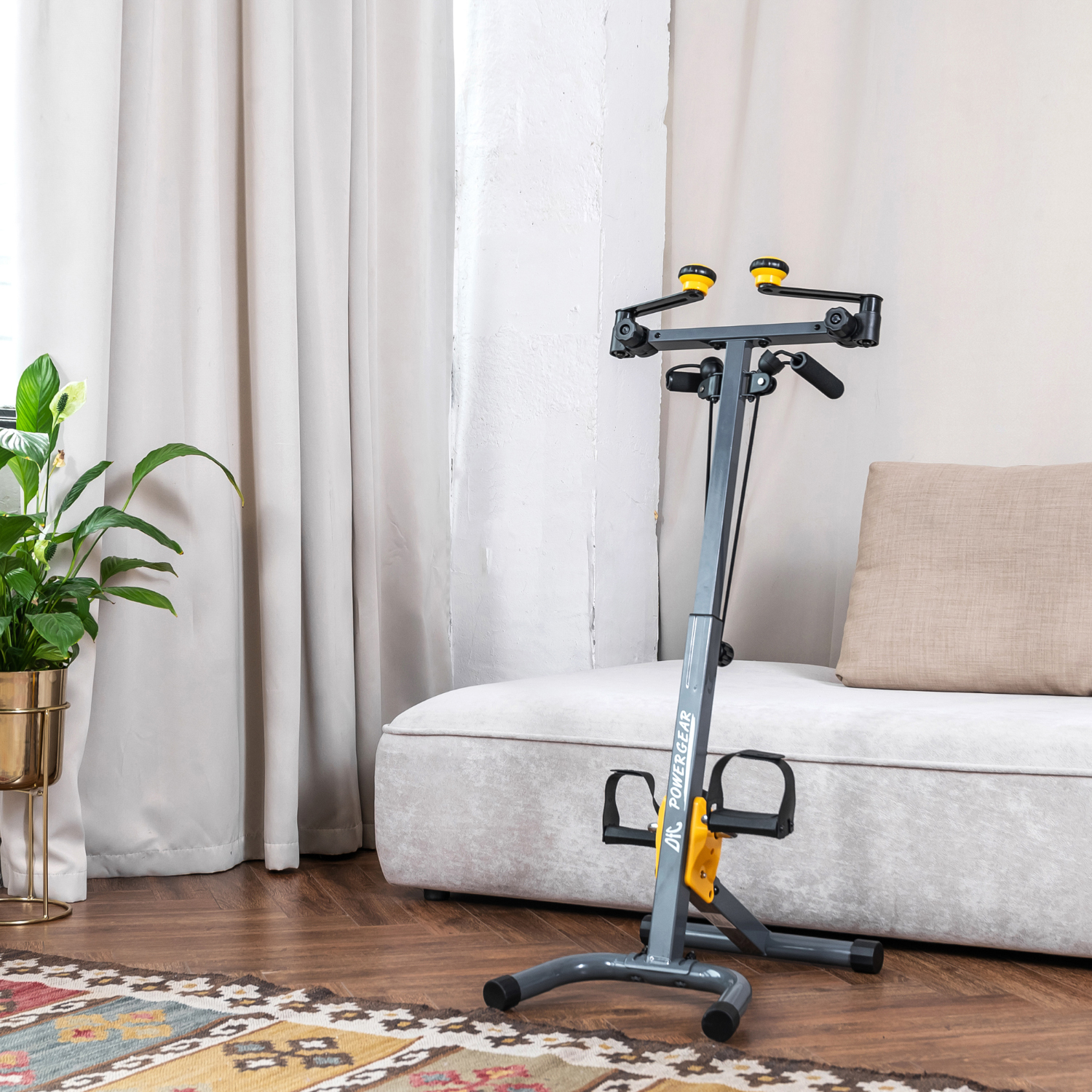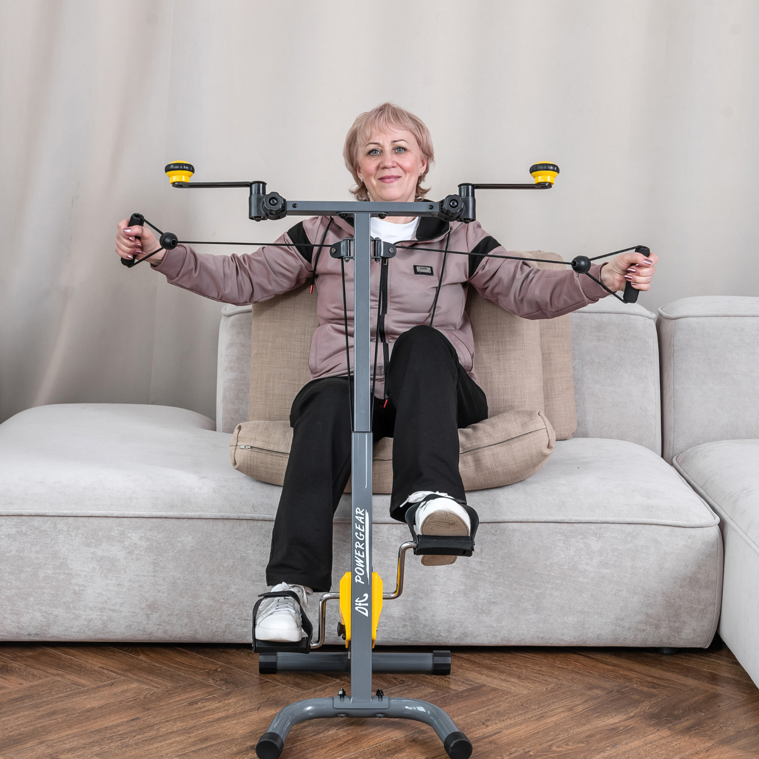 Велотренажёр двойной DFC B810Y DUAL BIKE MAXI с накладками и ручками желтого цвета для домашнего использования. Многофункциональная модель позволяет тренировать как руки, так и ноги одновременно или врозь. Для разнообразия тренировок в комплекте поставляются эспандеры.