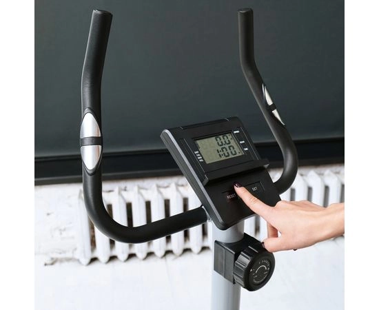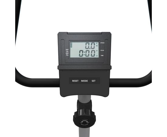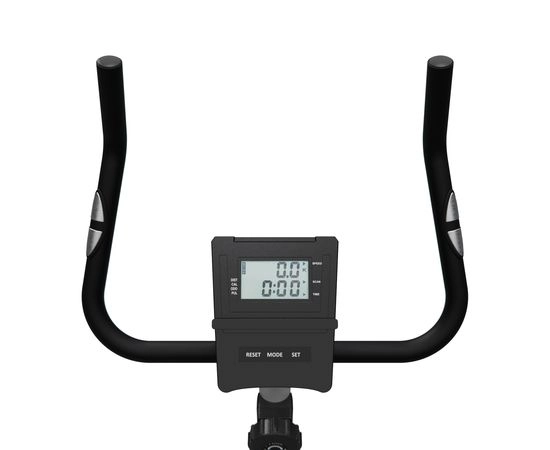 Монохромный LCD дисплей велотренажера отображает следующие показатели: скан, скорость, время, калории, пульс и расстояние. Для работы консоли требуются 2 батарейки типа ААА (не входят в комплект).