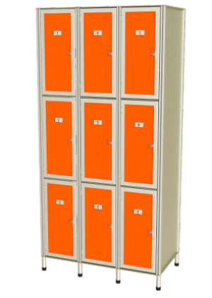 Шкаф для раздевалки АquaLocker-3T состоит из 3-х секций по 3 ячейки (общее количество ячеек в модуле – 9 шт.). Внутри каждой ячейки могут быть установлены 2 крючка для одежды (опция). Также как и все шкафы серии «АquaLocker», данная модель выполнена из алюминиевых композитных панелей и алюминиевого профиля и отвечает самым строгим требованиям к мебели для бассейна.