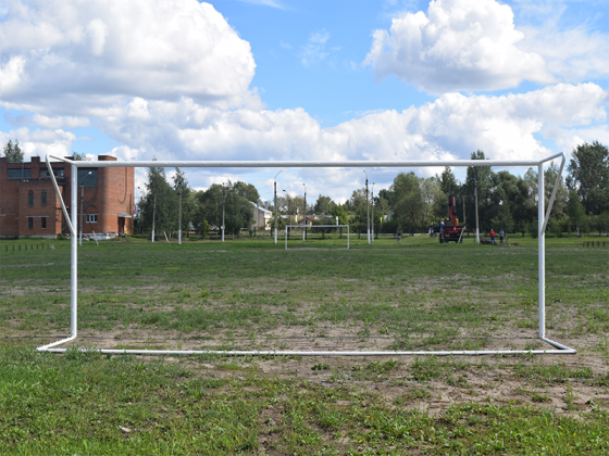 Футбольные ворота со стойками, закреплёнными в установочных гильзах, и консолью для натяжения сетки. Предназначены для использования на открытых площадках. Cоответствуют ГОСТ Р 55664-2013 "Оборудование для спортивных игр. Ворота футбольные" тип 2.