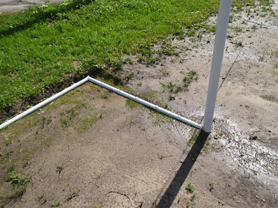 Цельносварная конструкция. Створ футбольных ворот (штанга и верхняя перекладина) изготовлены из стальной круглой трубы D=76 мм.