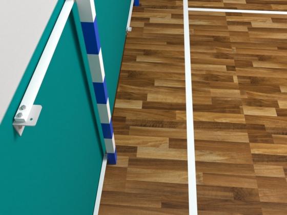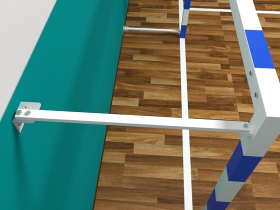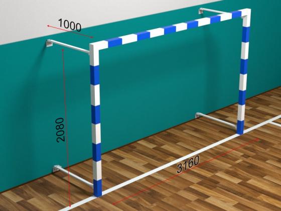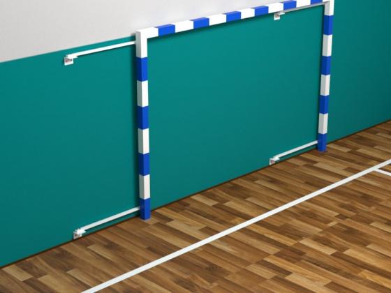 Рама ворот выполнена из профильной трубы 80х80 мм. Ворота стационарные, крепятся к стене с помощью закладных деталей, которые поставляются с воротам в комплекте. Складываются только в одну сторону. Могут быть сняты с места установки, разобраны и убраны в место хранения. Складная конструкция очень удобна тем, что ворота вне эксплуатации не занимают много места. Данная конструкция особенно актуально в маленьких спортивных залах.