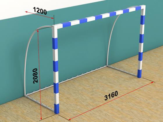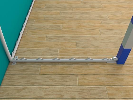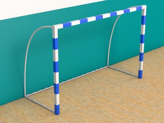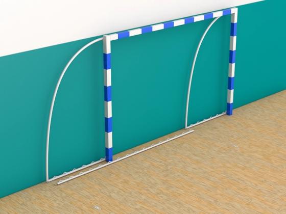 Рама ворот выполнена из профильной трубы 80х80 мм. Ворота стационарные, крепятся к полу с помощью закладных деталей, которые поставляются с воротам в комплекте. Складываются только в одну сторону. Могут быть сняты с места установки, разобраны и убраны в место хранения. Складная конструкция очень удобна тем, что ворота вне эксплуатации не занимают много места. Данная конструкция особенно актуально в маленьких спортивных залах.