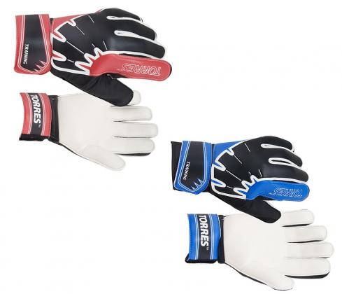 Вратарские перчатки TORRES Training, уровень - тренировочный.Ладонь изготовлена из латекса толщиной 3 мм, тыльная сторона из синтетической кожи ПВХ толщиной 1 мм с рельефным рисунком. Внутренняя подкладка из мягкой ткани для комфортного использования. Боковые вставки в пальцах изготовлены из мягкой дышащей ткани, манжеты из синтетической кожи (ПУ). Манжеты на удлиненной застежке шириной 5 см c липучкой.Страна-производитель: Пакистан